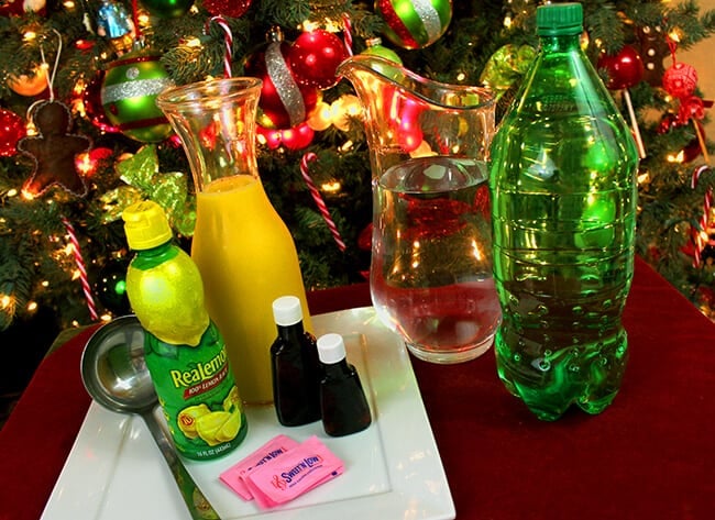 Christmas time is here! and it is time for holiday parties, get togethers, and gatherings with family and friends. you may need a fun and quick recipe for one of your Christmas events, so i am showing you this Grinch Juice recipe inspired by one of my all-time favorite Christmas stories, How The Grinch Stole Christmas. so i love to make this green punch and call it Grinch Juice! by dressing up the punch bowl and adding a few fun garnishes, your guest will definitely not be Grinches this year.to make this Grinch Juice, you will need blue food coloring, orange juice, lemon juice, Sweet’N Low, water, vanilla extract, almond extract and lemon-lime soda.