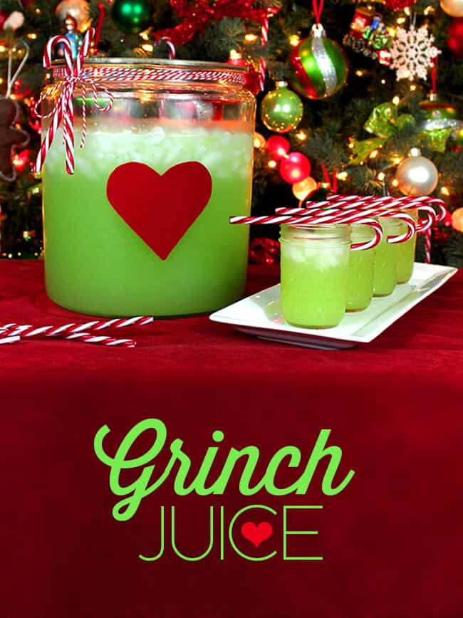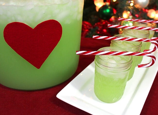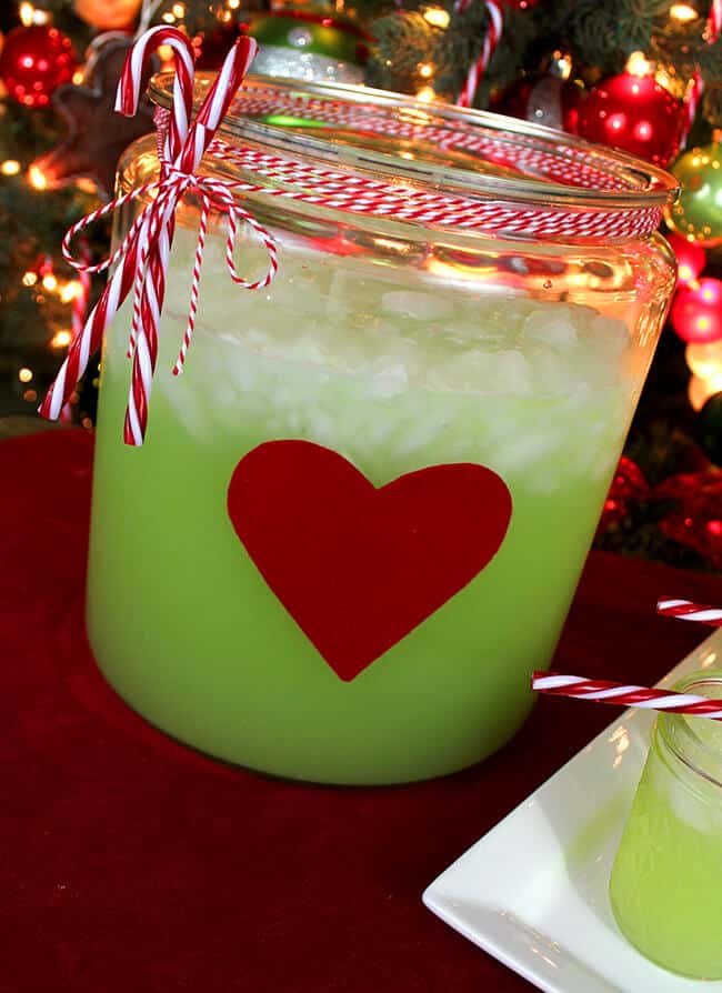 to make my Grinch Juice extra festive, i like to use a tall, clear glass punch bowl or clear glass pitcher. then i cut out a heart out of felt or cardstock and affix it on the front of the bowl or pitcher to represent the Grinch’s heart that finally grew 3 sizes the year that he brought Christmas back to the Whos. you can also place How The Grinch Stole Christmas story book next to the juice…or make a fun sign.